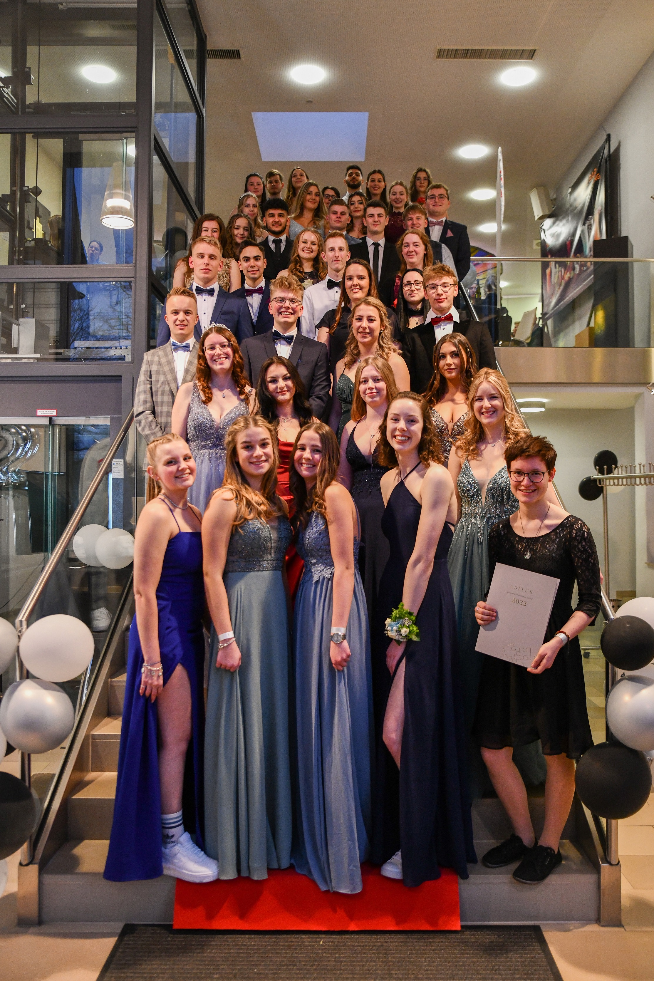 Verliehen wurden zahlreiche Preise für besondere Leistungen in den Fachbereichen sowie für soziales Engagement, bevor die Übergabe der Abiturzeugnisse durch Frau Hofmann und Frau van der Koelen sowie die Stammkursleitungen den Höhepunkt des offiziellen Teils markierte. Besondere Begeisterung löste anschließend das Männerballett aus, bei dem Schüler der Stufe im Ballettröckchen ihr tänzerisches Talent unter Beweis stellten. Im folgenden inoffiziellen Teil feierten die Abiturientinnen noch lange mit Freunden, Familie und Lehrkräften.