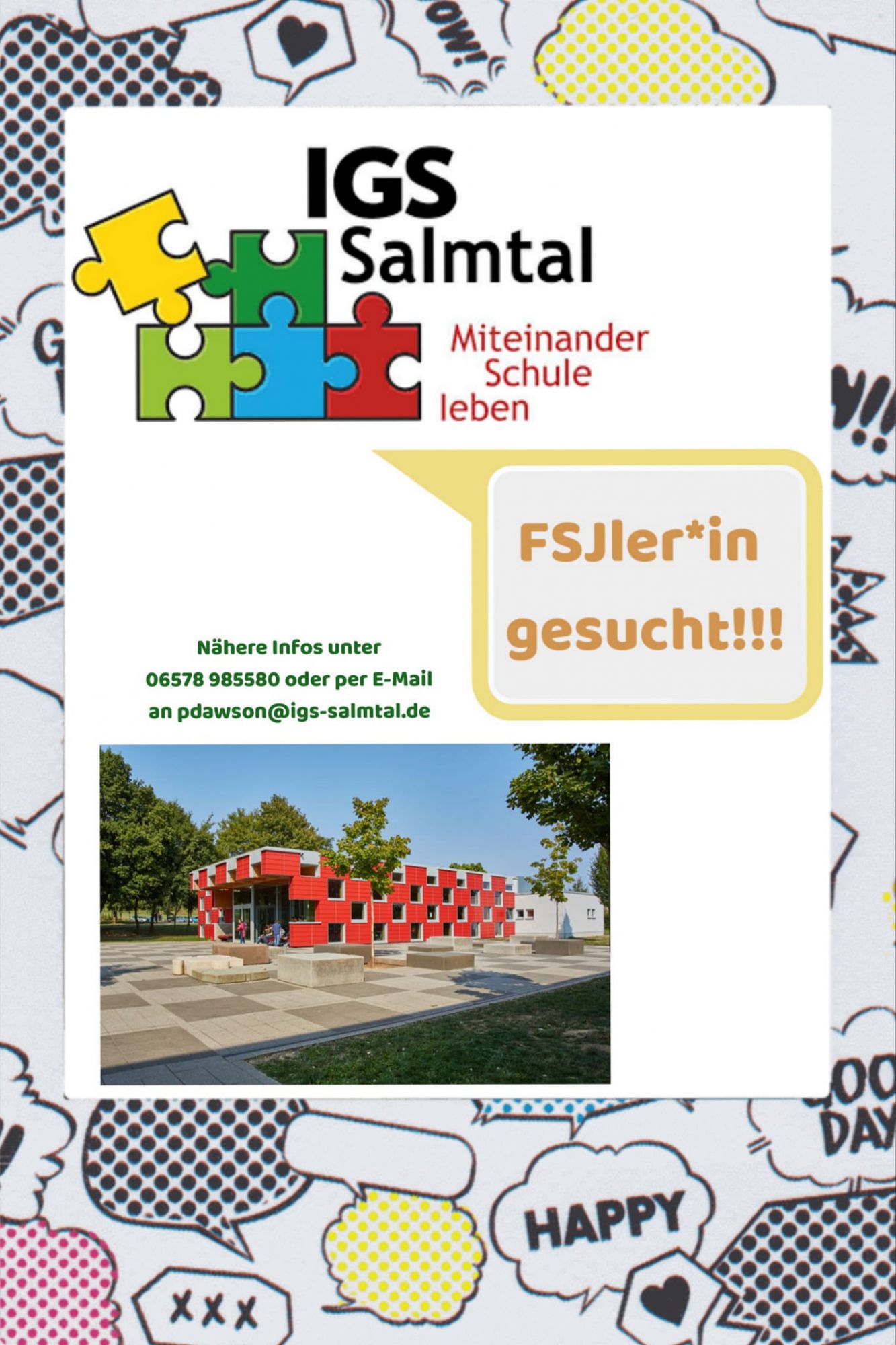 Die IGS Salmtal bietet auch im kommenden Schuljahr 2024/2025 wieder Plätze zum Absolvieren eines Freiwilligen Sozialen Jahrs und einen Platz für ein Praktikum zur Erzieher:in an. Bis zum 01. Mai 2024 können sich Interessierte an der Integrierten Gesamtschule Salmtal dafür bewerben.