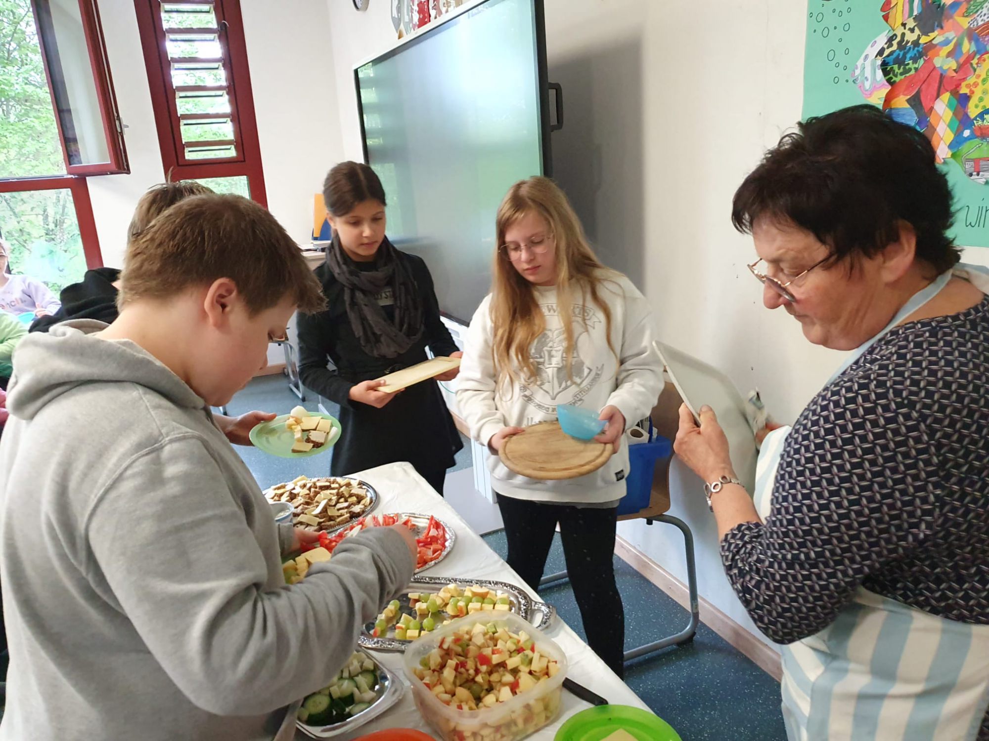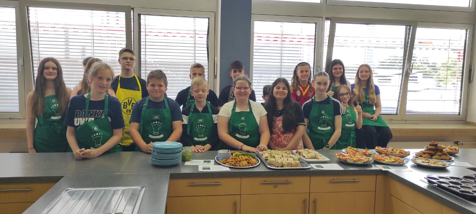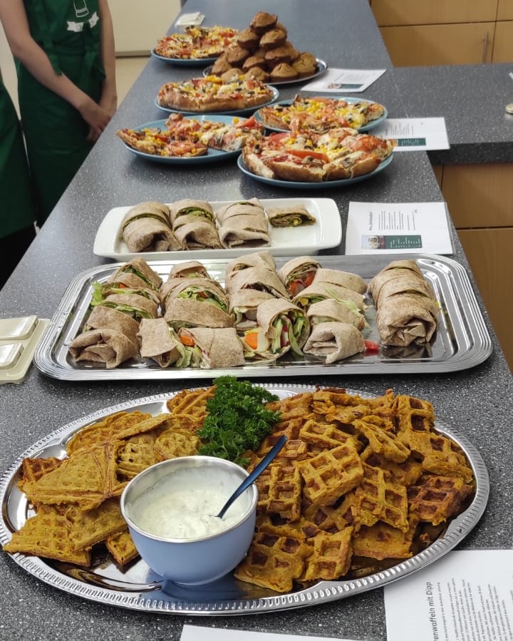 Die Schüler/innen der Klasse 7b hatten dabei einen unvergesslichen Tag mit der Ernährungsberaterin Frau Jüngling von der AOK. In Vierer-Gruppen kochten und backten sie leckere Gerichte, wie zum Beispiel: Bananen-Muffins, klimafreundliche Wraps, Radieschenblätter-Pesto, Möhrenwaffeln mit Dipp oder eine "Schnelle" Pizza. Der gesamte Kochkurs wurde mit hauptsächlich regionalen, gesunden und veganen Lebensmitteln durchgeführt. Dass dabei alles ohne Fleisch und Zucker zubereitet wurde, kam zwar bei einigen Schülerinnen und Schülern nicht so gut an, doch die Freude beim gemeinsamen Kochen war der gesamten Klasse sowie den Klassenlehrern Herrn Schmitz und Frau Thomas ins Gesicht geschrieben.