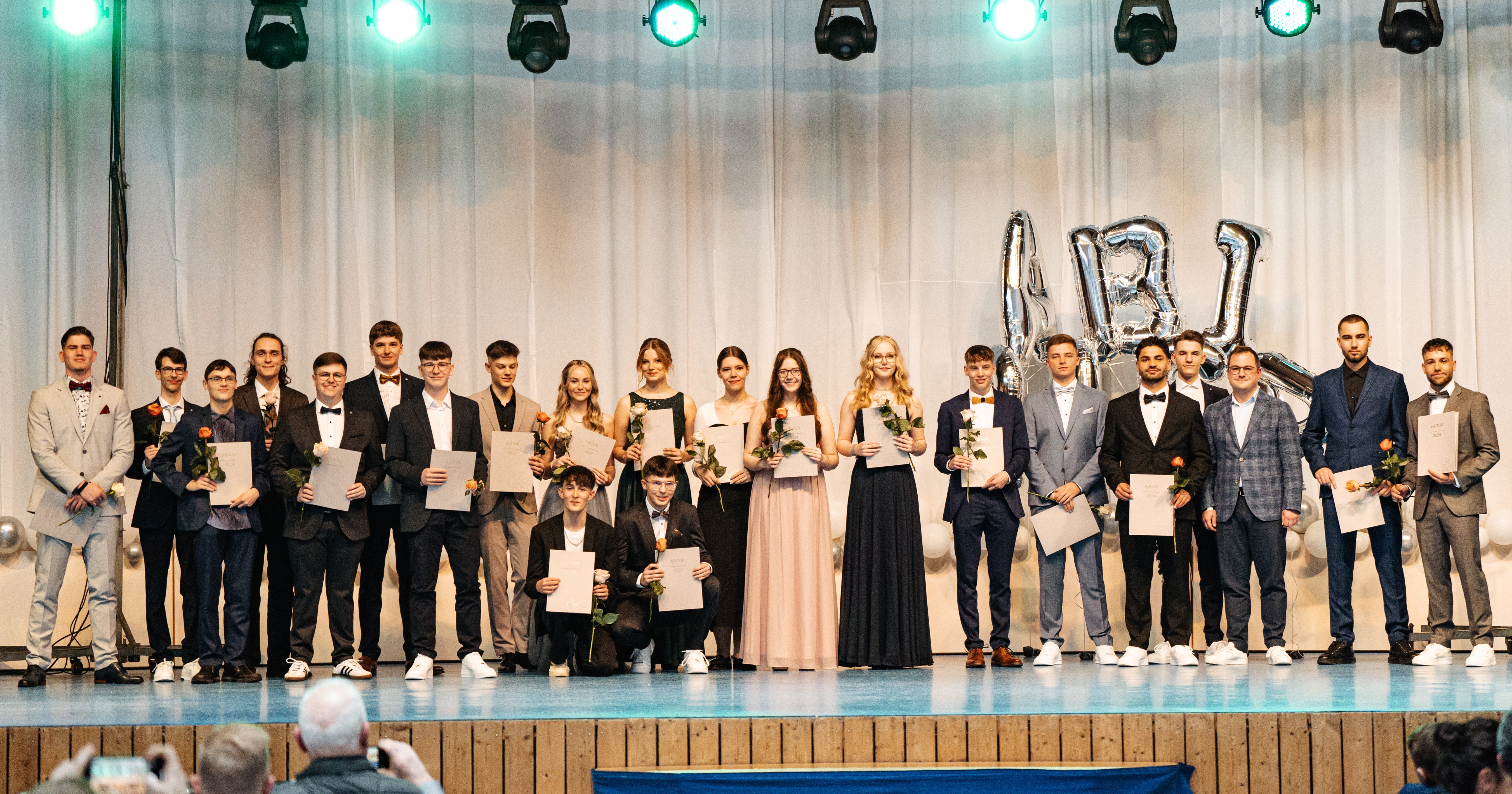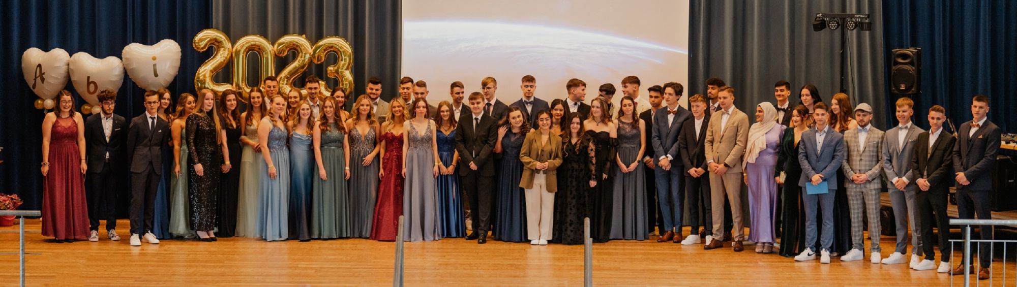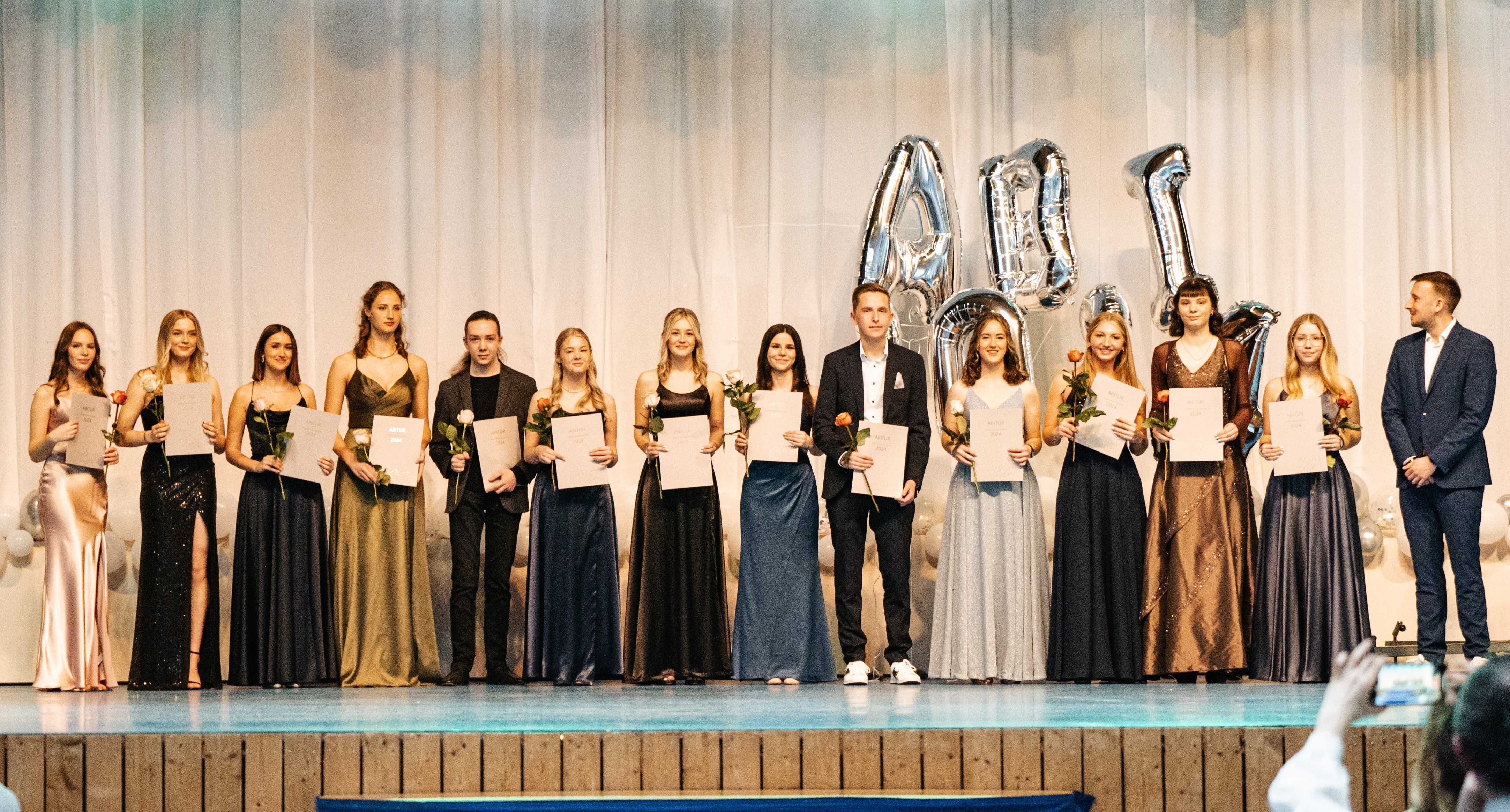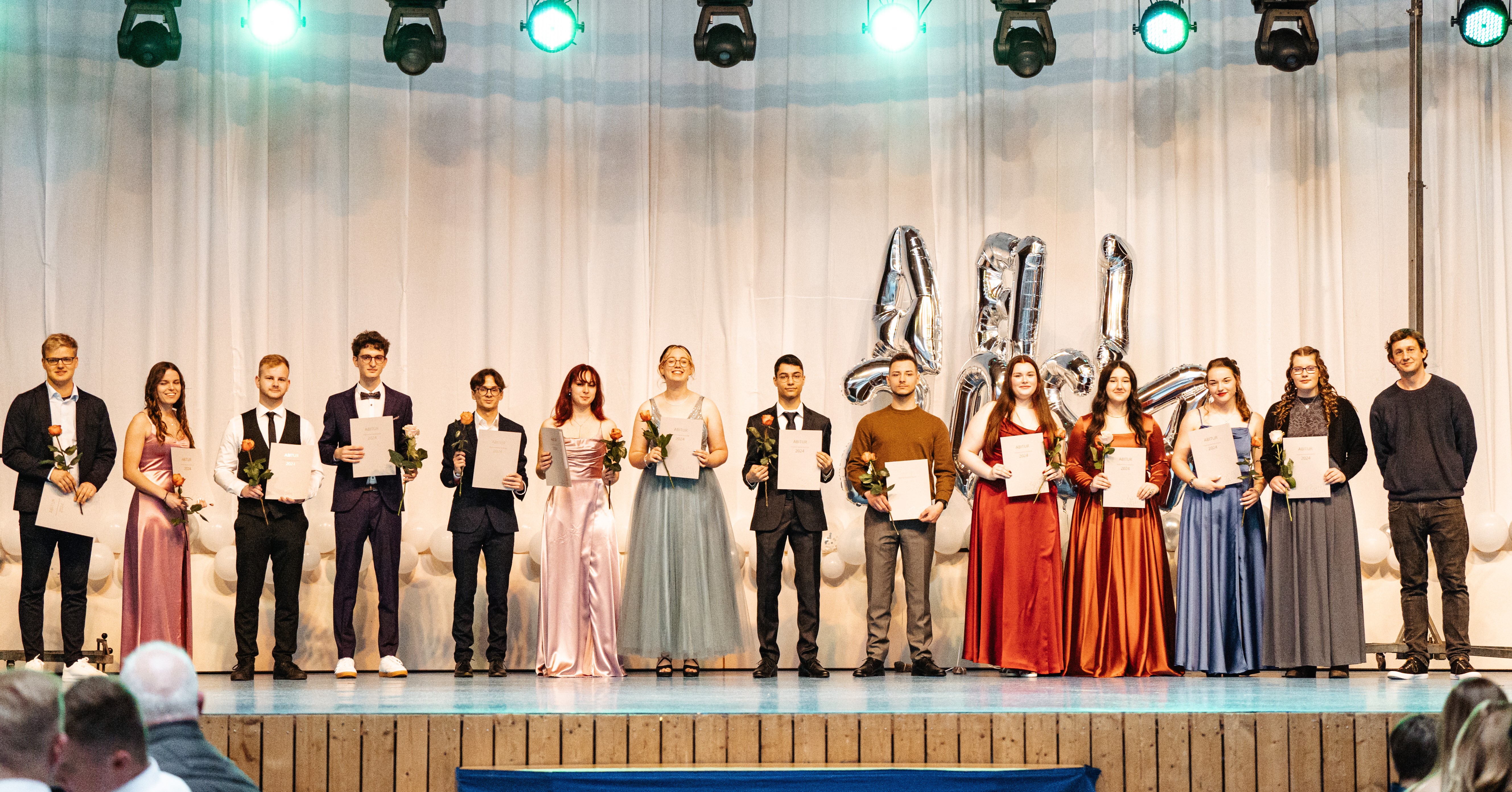 Verliehen wurden zahlreiche Preise für besondere Leistungen in den Fachbereichen sowie für soziales Engagement, bevor die Übergabe der Abiturzeugnisse durch Frau Hofmann und Frau van der Koelen sowie die Stammkursleitungen den Höhepunkt des offiziellen Teils markierte. Besondere Begeisterung löste anschließend das Männerballett aus, bei dem Schüler der Stufe im Ballettröckchen ihr tänzerisches Talent unter Beweis stellten. Im folgenden inoffiziellen Teil feierten die Abiturientinnen noch lange mit Freunden, Familie und Lehrkräften.