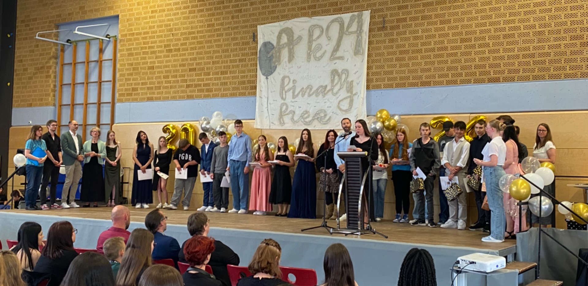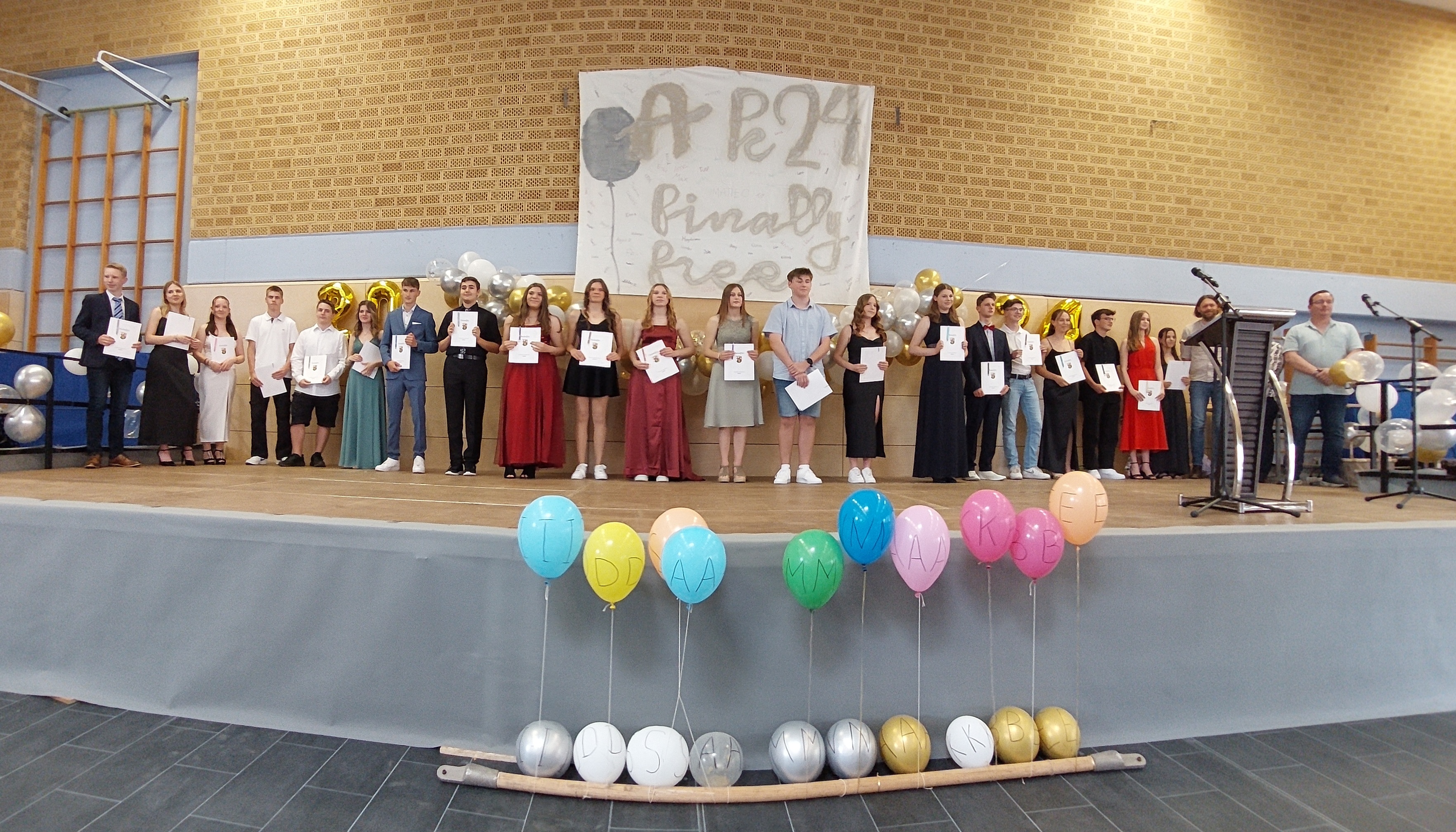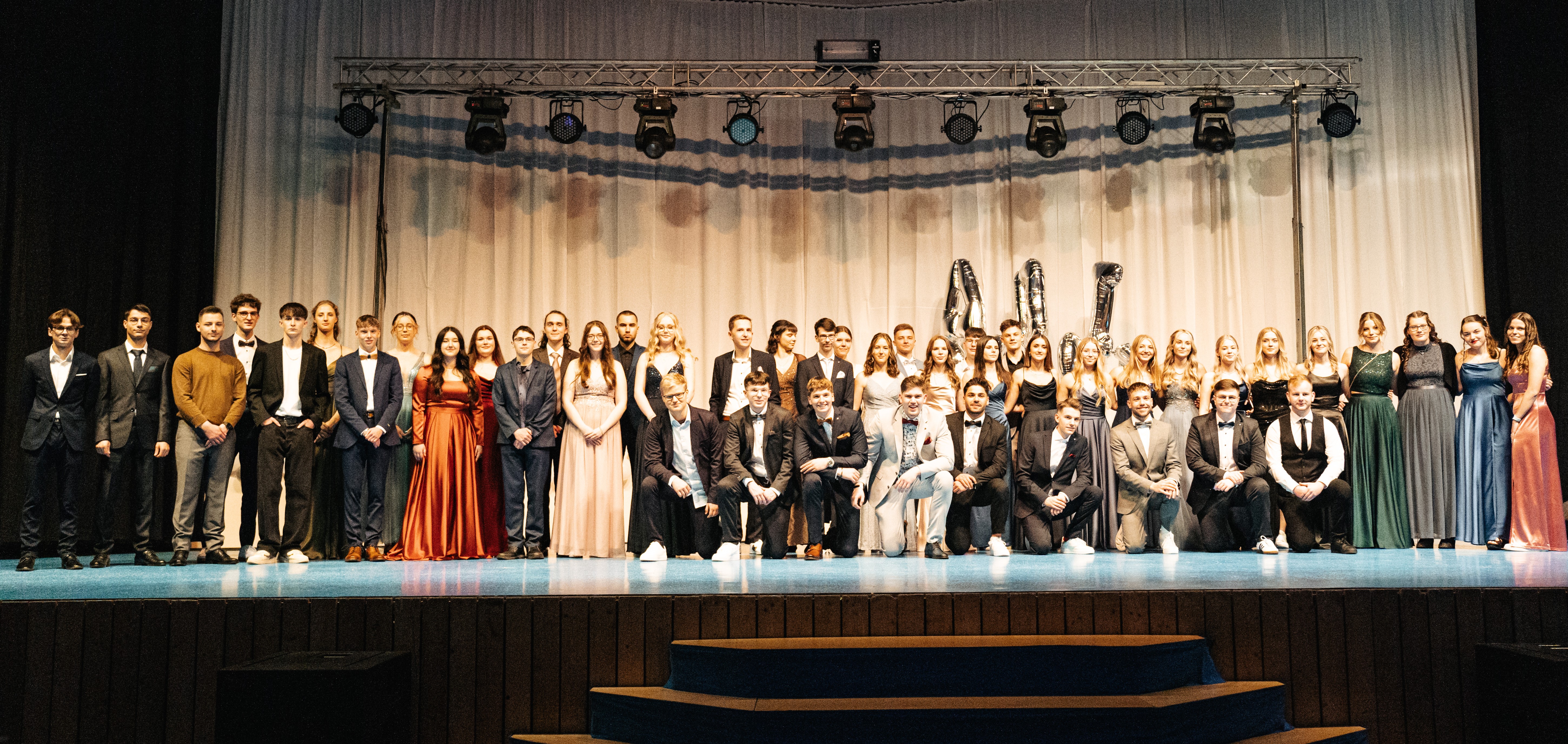 Verliehen wurden zahlreiche Preise für besondere Leistungen in den Fachbereichen sowie für soziales Engagement, bevor die Übergabe der Abiturzeugnisse durch Frau Hofmann und Frau van der Koelen sowie die Stammkursleitungen den Höhepunkt des offiziellen Teils markierte. Besondere Begeisterung löste anschließend das Männerballett aus, bei dem Schüler der Stufe im Ballettröckchen ihr tänzerisches Talent unter Beweis stellten. Im folgenden inoffiziellen Teil feierten die Abiturientinnen noch lange mit Freunden, Familie und Lehrkräften.