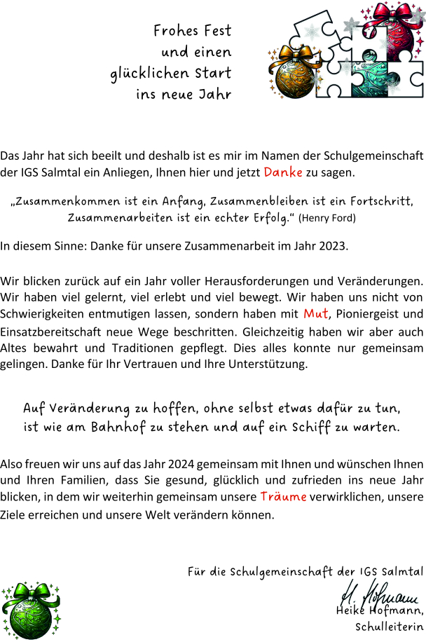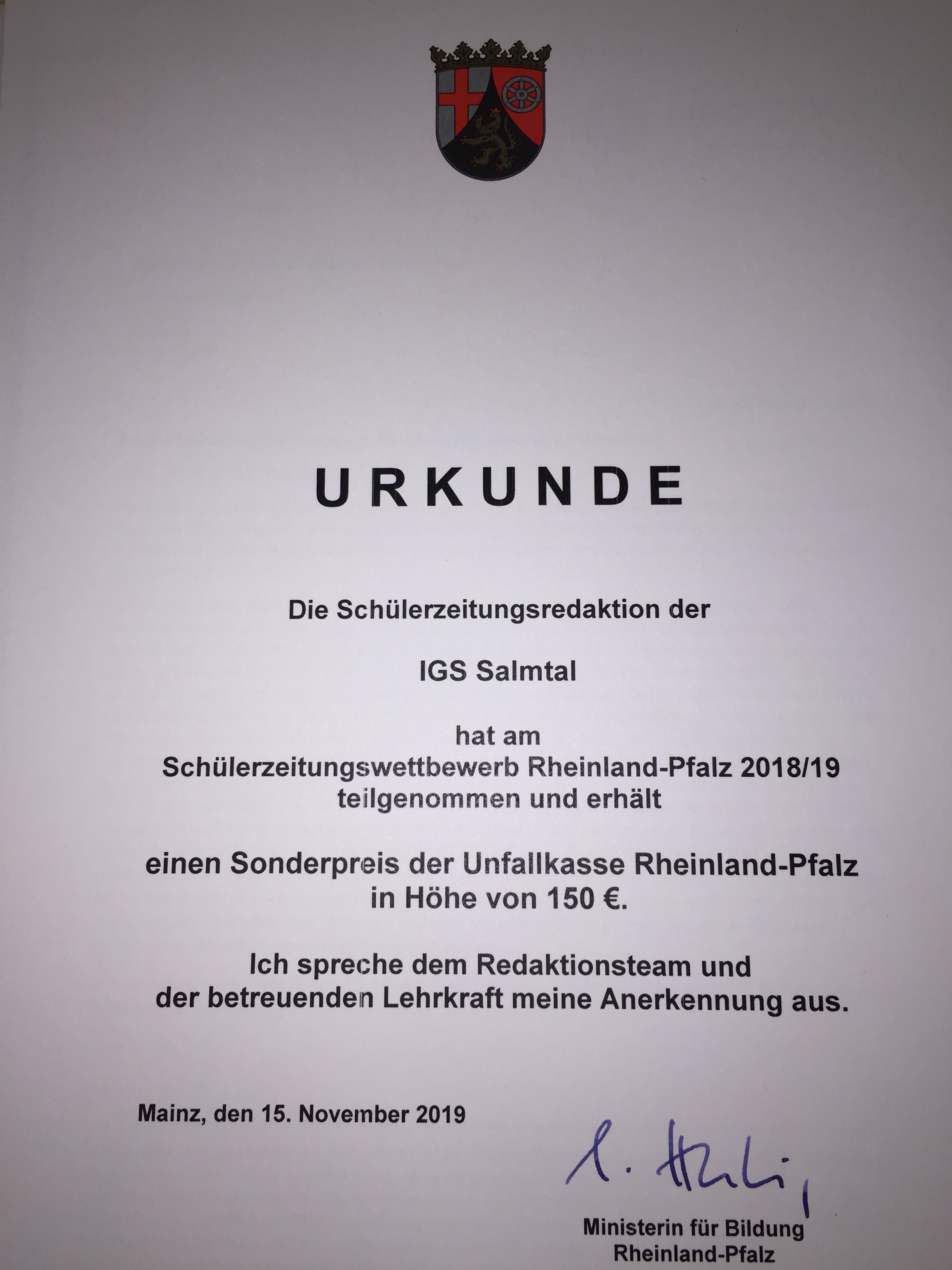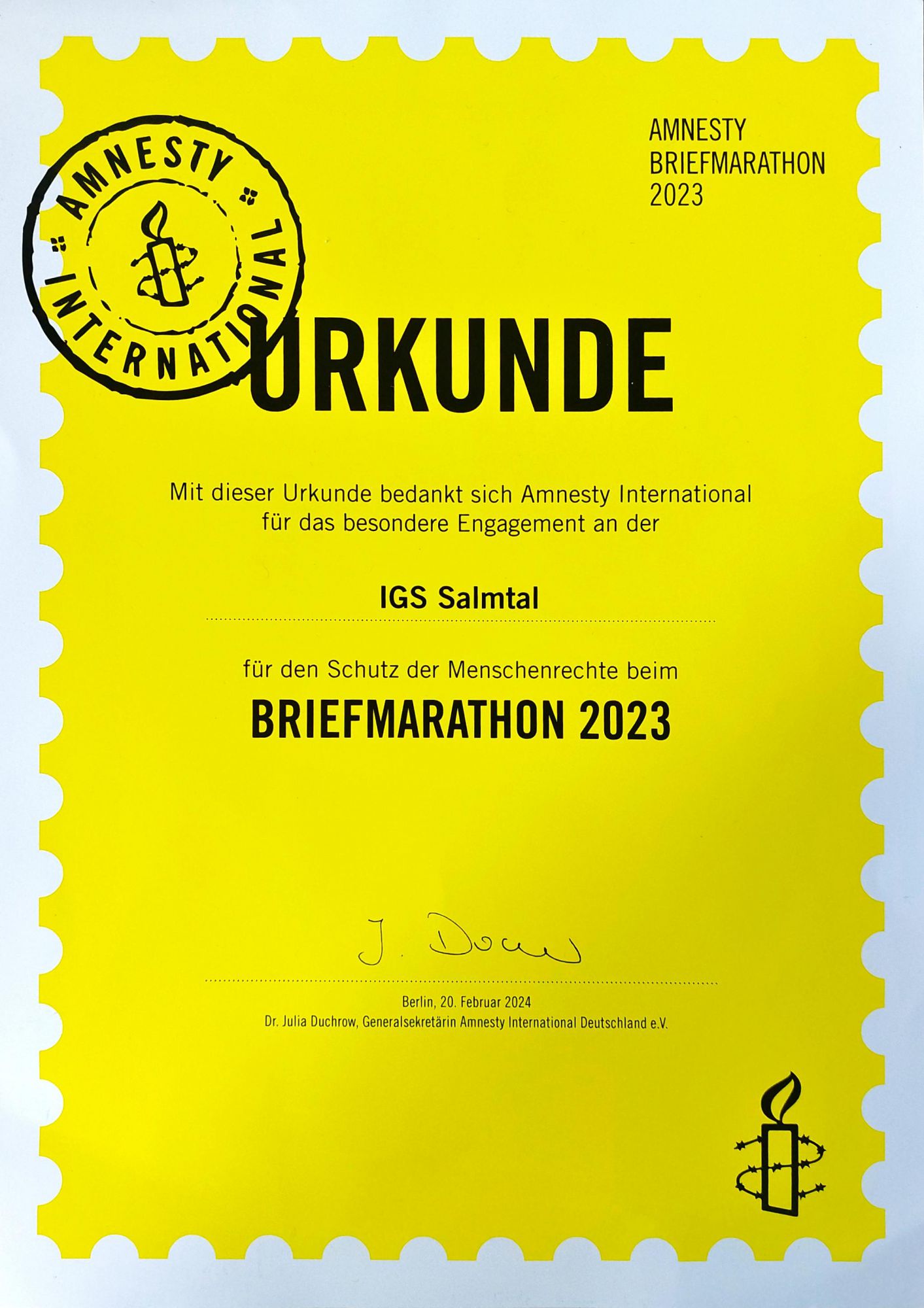 Seit 2018 nimmt die IGS Salmtal jährlich am Amnesty Briefmarathon teil. Auch in diesem Schuljahr konnte sich die Schule wieder für zehn Menschen einsetzen. Eine Woche lang wurden erfolgreich zahlreiche Briefe verfasst, weshalb Amnesty International der IGS in Salmtal für diesen Einsatz für die Menschenrechte diese Urkunde übersendet hat.