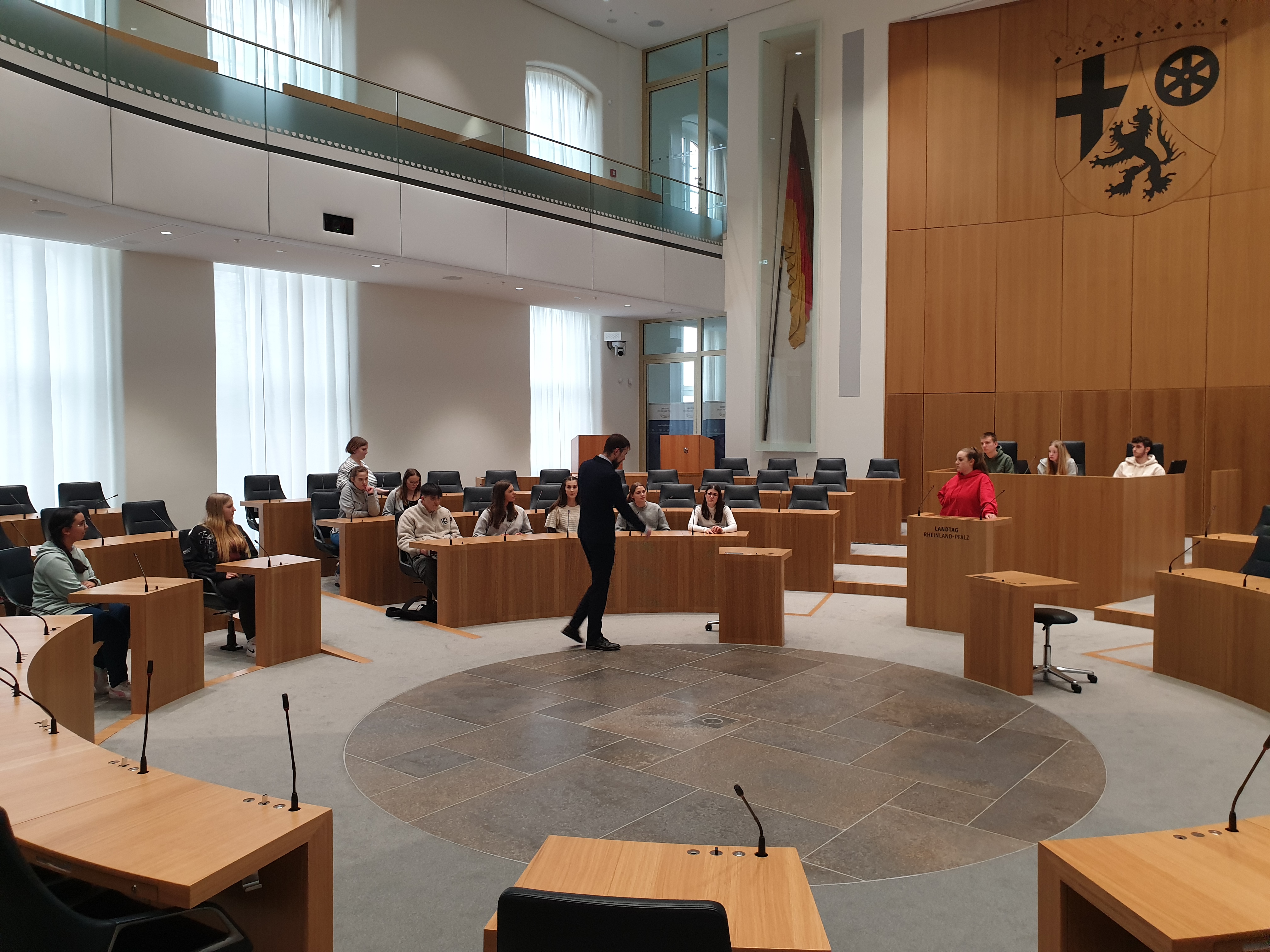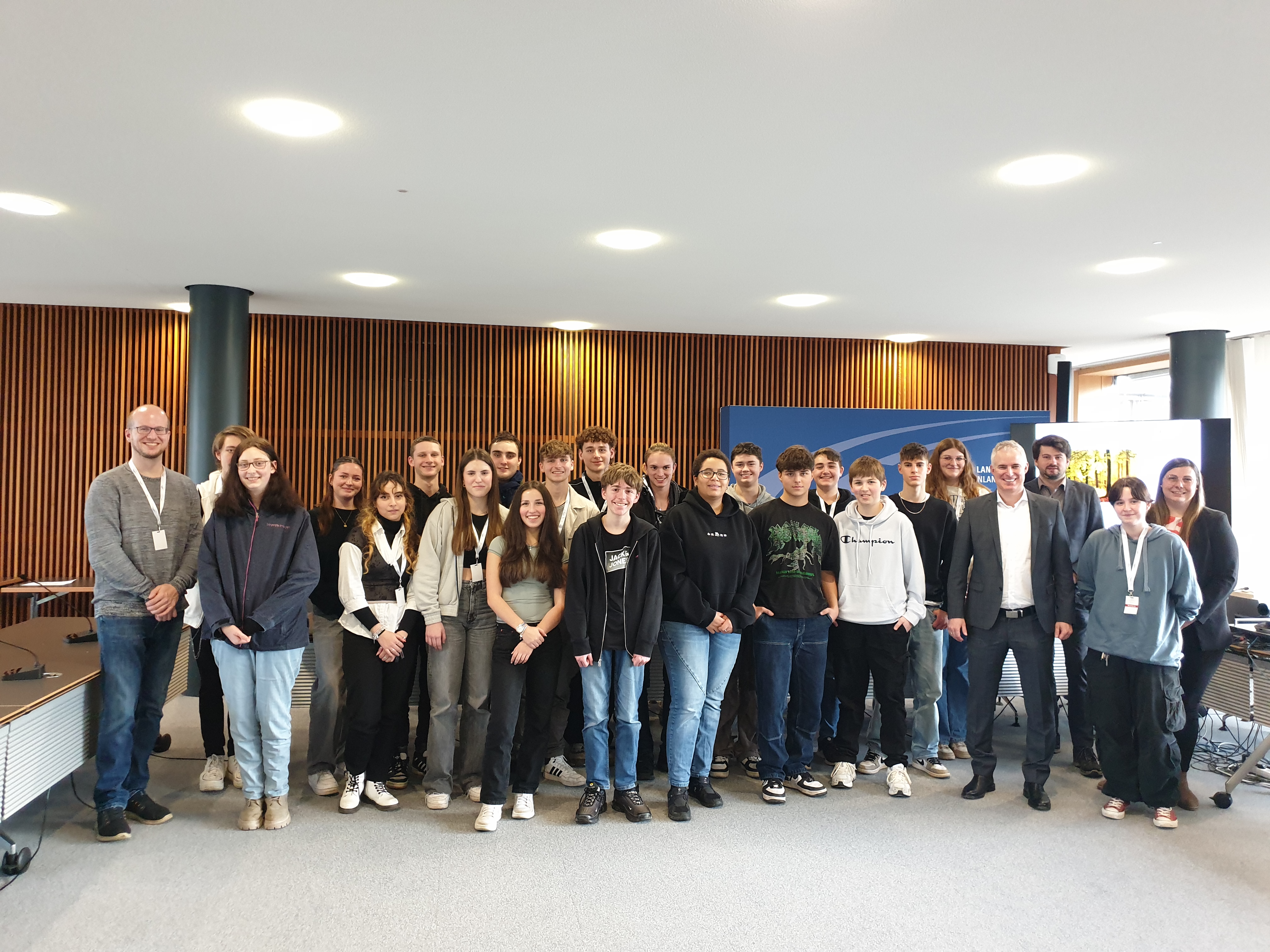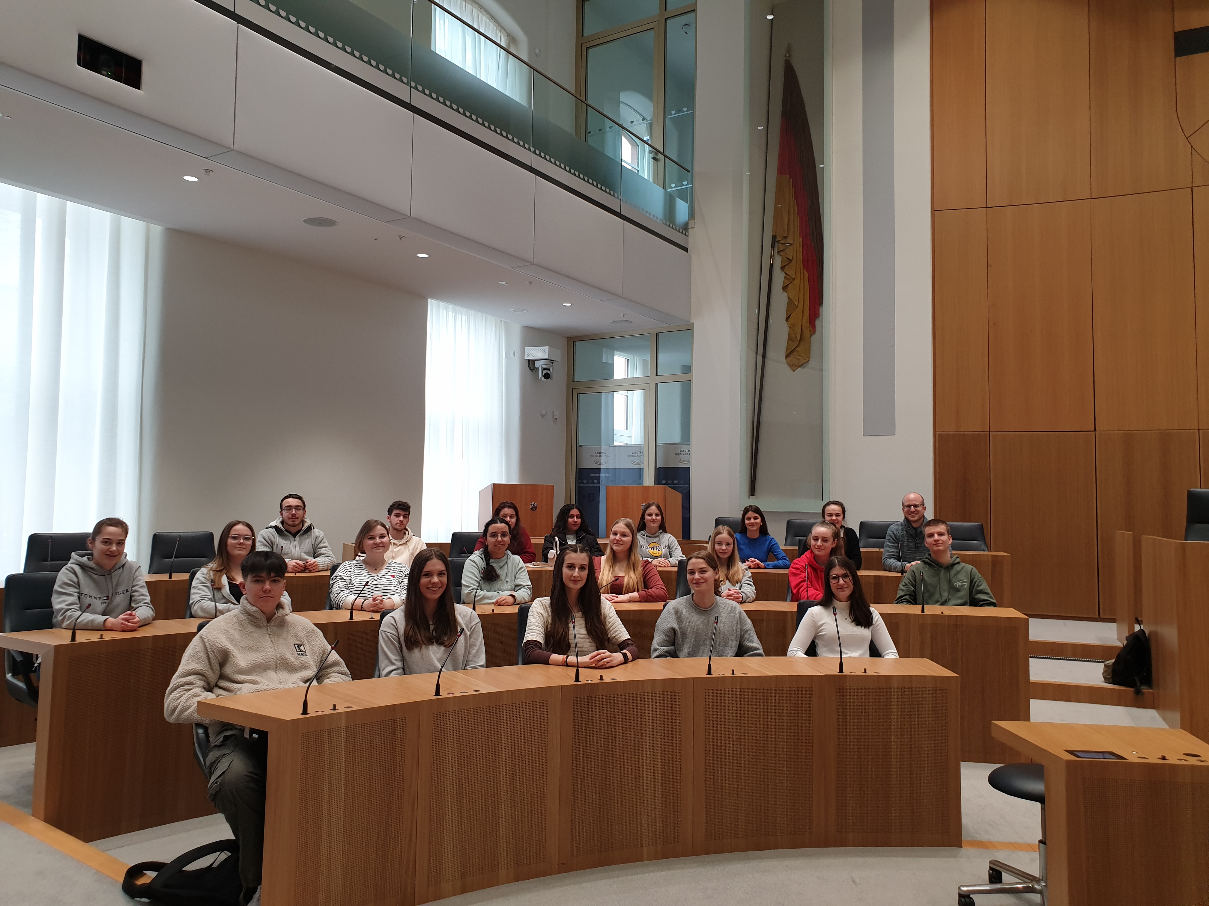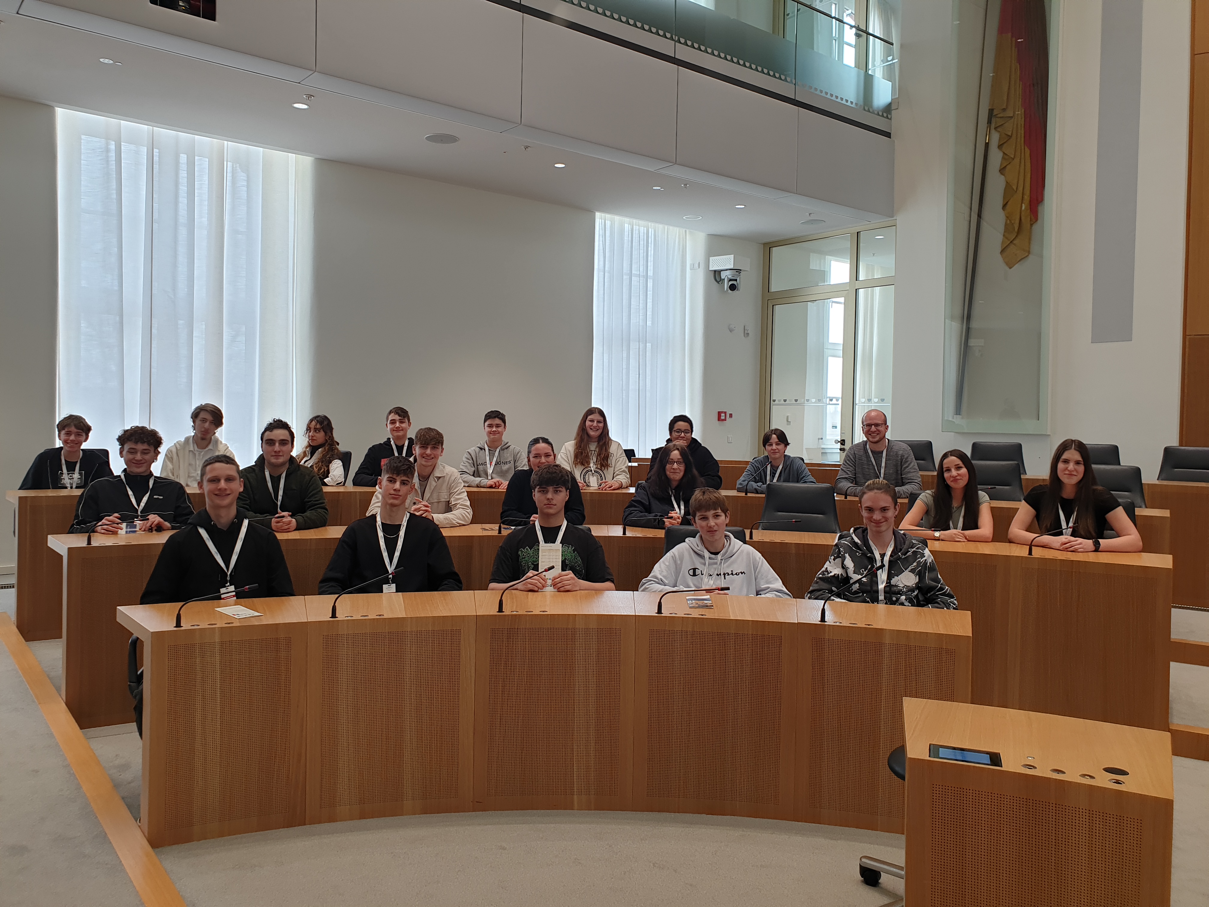 Unsere Schülerinnen und Schüler mit ihrem Lehrer Christoph Schmalen im Landtag beim Landtagsabgeordneten Dennis Junk