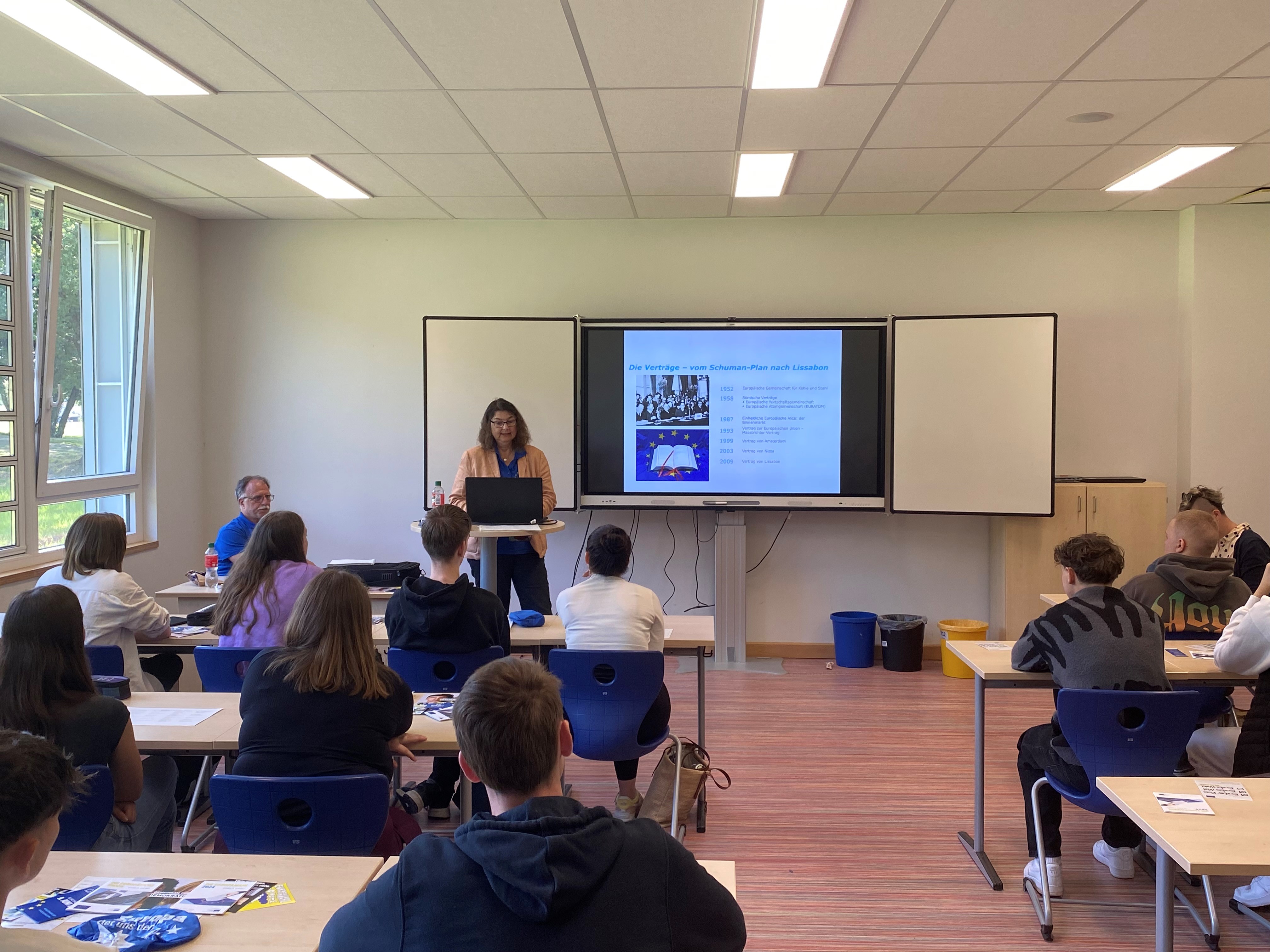 Am 07.06.2024 durfte die gesamte Jahrgangsstufe 11am Projekt „Europa in die Schule 2024" teilnehmen. Da alle ab16 Jahrenam 9. Juni 2024 erstmals in Deutschland Wahlrecht bei der Europa-Wahl hatten, war das Projekt für alle von besonderer Bedeutung. Fr. Márta Nagy-Rothengass (Referatsleiterin bei der Europäischen Kommission) und Matthias Rothengass (Vorsitzender Kreisverband Trier der Europa-Union Rheinland-Pfalz e. V.) informierten die Schülerinnen und Schüler rund um die Geschichte, den Aufbau und den Binnenmarkt der EU. Ein weiterer Schwerpunkt lag außerdem auf dem inhaltlichen Vergleich der einzelnen Parteien, die zur Wahl standen.