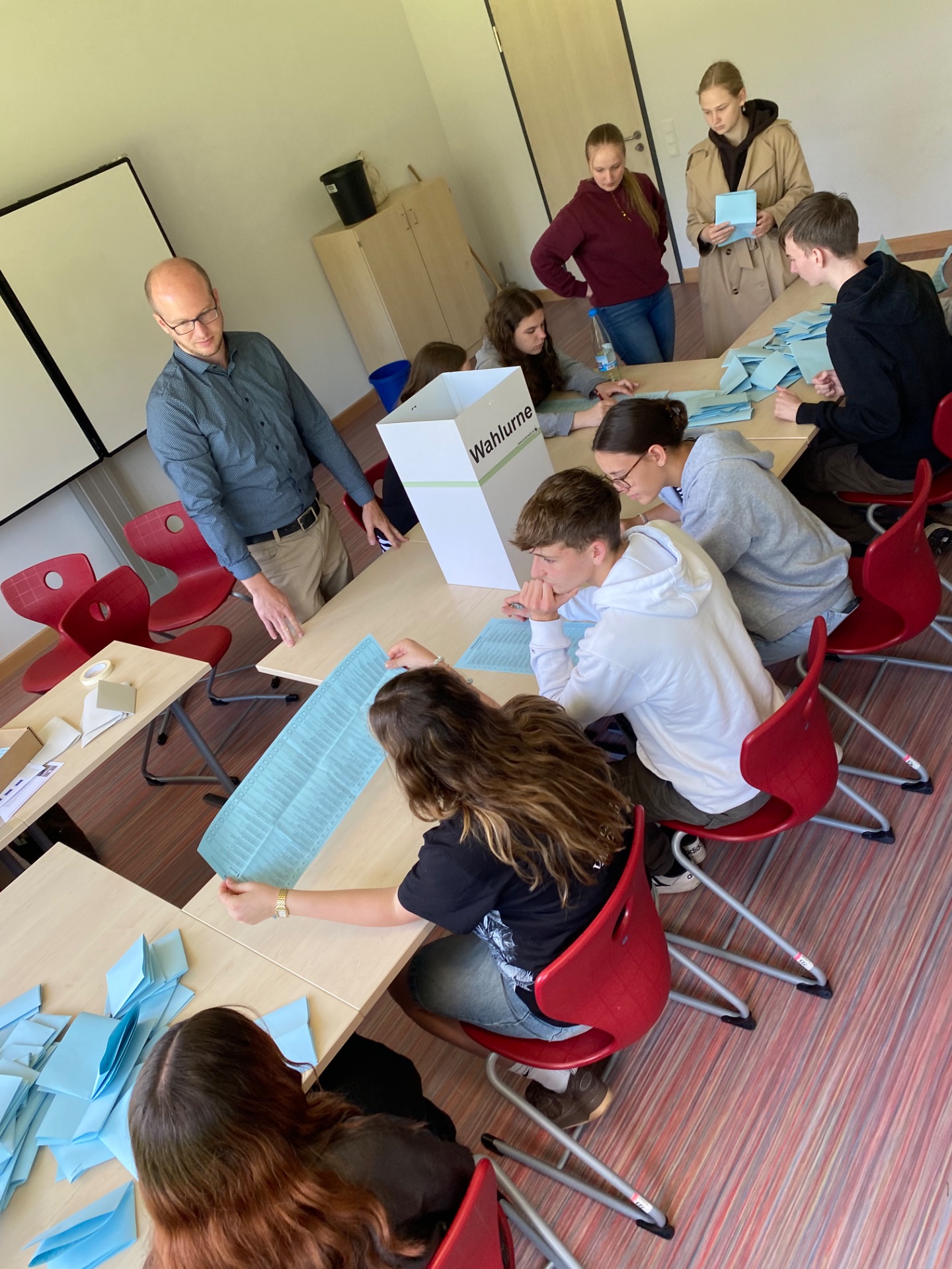 Herr Schmalen mit dem Leistungskurs Sozialkunde 12 bei der Durchführung der Juniorwahl