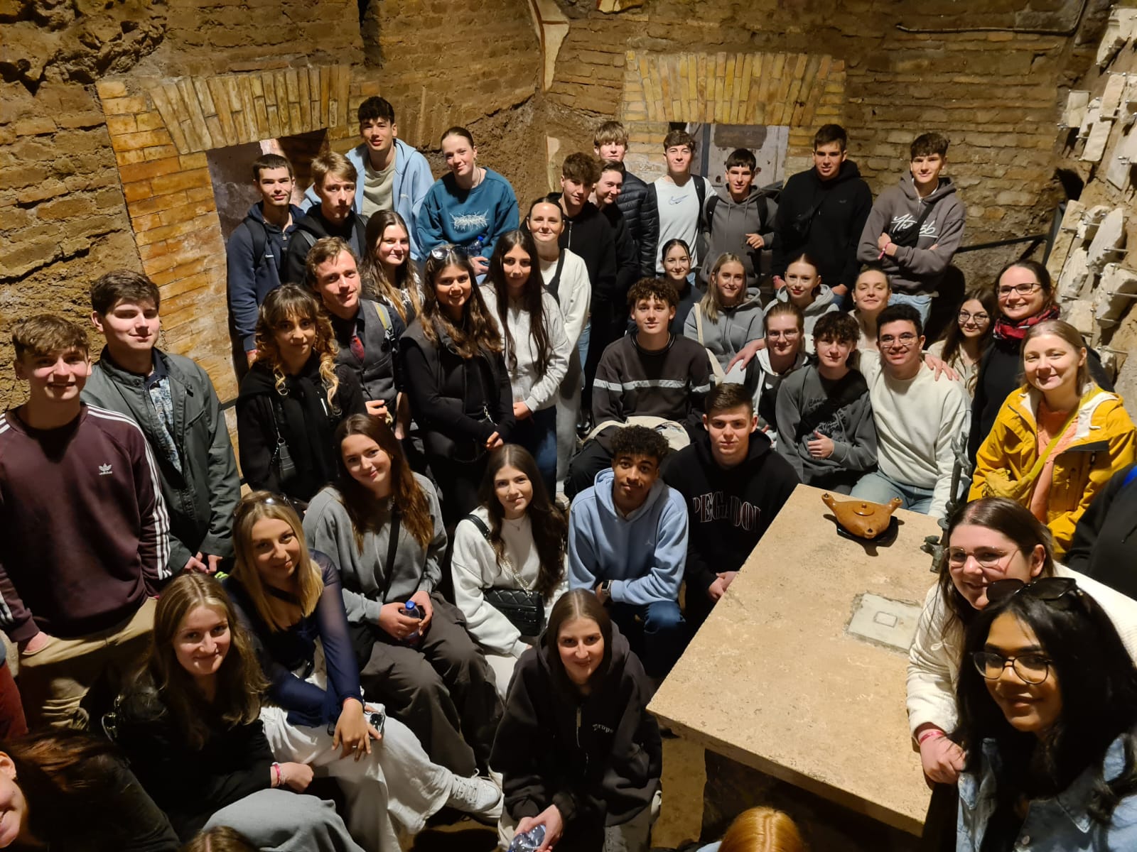 Eine Führung der besonderen Art, die ihnen immer in Erinnerung bleiben wird, konnten die Schüler:innen und ihre Lehrkräfte in den Domitilla-Katakomben sowie der Katakombenbasilika erleben. Der aus Deutschland stammende Fremdenführer brachte den Schüler:innen die Katakomben mit ihren vier bis fünf Meter hohen eingelassenen Gräbern aus dem ersten bis vierten Jahrhundert so toll nahe, dass sie ihn am liebsten als Redner auf die kommende Abifeier eingeladen hätten.