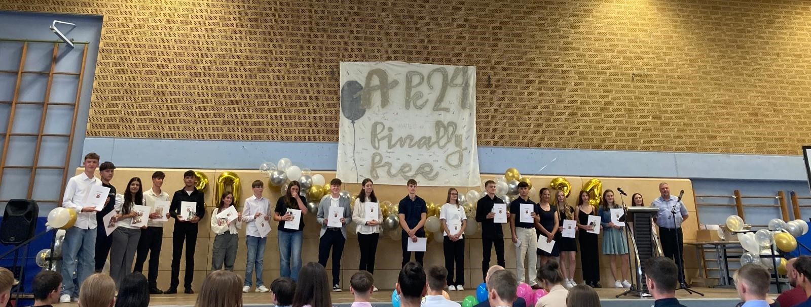Bestes Abitur: Vincent Schumann (1,2), Preis der Ministerpräsidentin: Niklas Stein, Preis der Fachschaft Erdkunde: Vincent Schumann, Preis der Fachschaft Chemie: David Leu, Sudarshan Morbach und Lucas Roth, Geschichte-Preis des Philologenverbandes: Leon Schramm, Preis der deutschen Mathematikervereinigung: Sudarshan Morbach, Preis der Fachschaft Biologie: Vincent Schumann