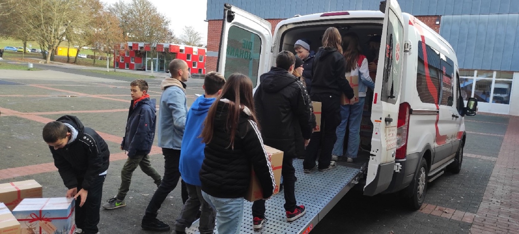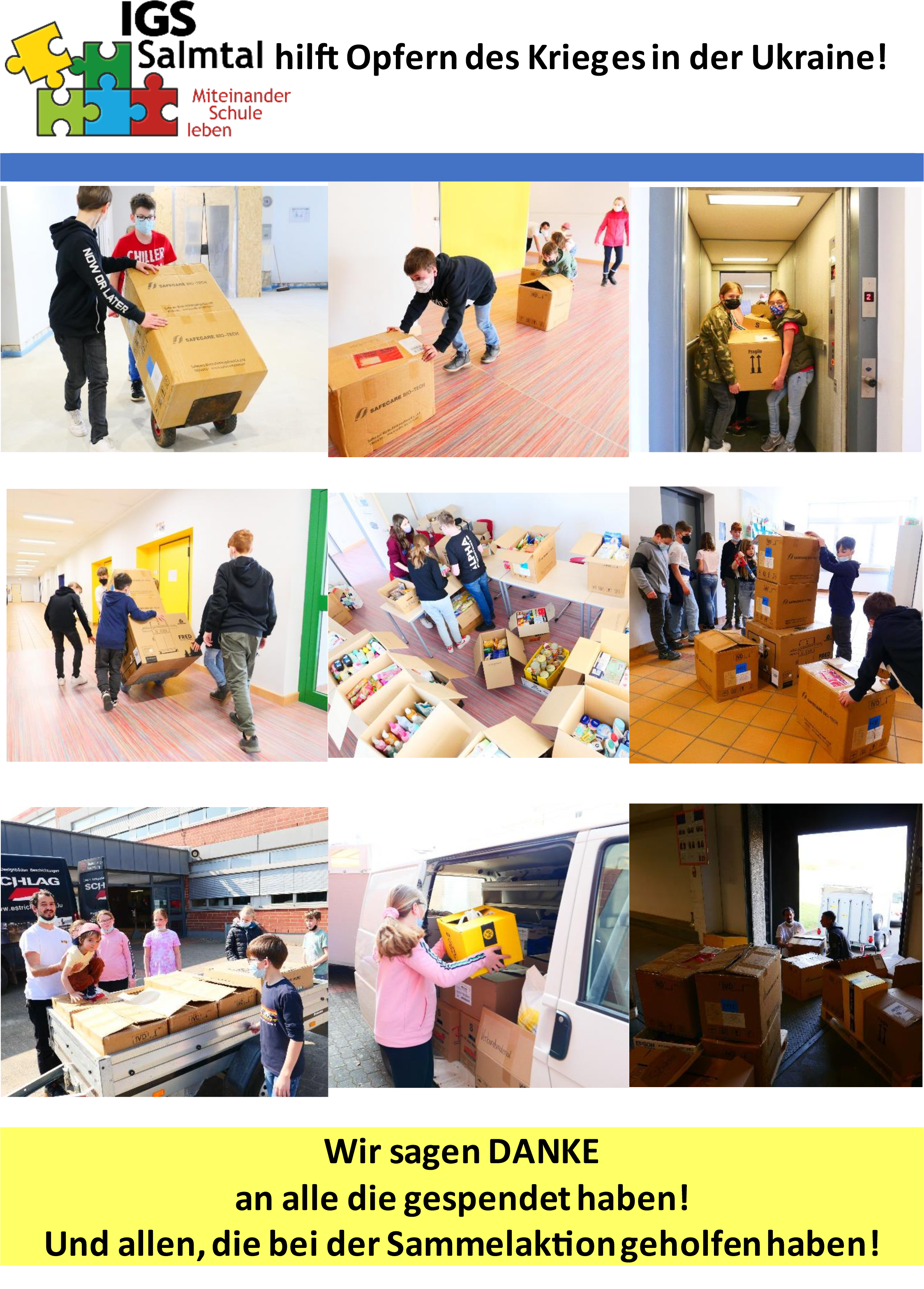 Die Flüchtlingssituation ist seit einiger Zeit nicht nur Thema der Medien und Erwachsenen, sondern auch die Kinder der IGS Salmtal machten sich kurz vor Weihnachten Gedanken darüber, ob es denn anderen Kindern ebenso gut ginge wie ihnen selbst. So entstand aus der Idee einer Fünftklässlerin die Aktion mit dem Motto „Es weihnachtet sehr“. Die Fünftklässler der IGS Salmtal packten für 90 Flüchtlingskinder, die derzeit in Wittlich untergebracht sind, fleißig Kartons mit Spielsachen, Schulmaterialien und kleinen Leckereien. Am 18.12.2015 war es dann soweit. Das Busunternehmen Schönhofen stellte einen Bus zur Verfügung, so dass die Kinder ihre Geschenke stolz und voller Freude im Fürstenhof in Wittlich persönlich übergeben konnten. Nachdem die ersten Barrieren durchbrochen waren, konnten alle Kinder den Nachmittag beim gemeinsamen Spielen ausklingen lassen. Die Kinder der IGS Salmtal machten durch ihre Aktion nicht nur den Flüchtlingskindern eine Freude, sondern werden sich auch selbst immer an diesen emotionalen Tag erinnern. Unterstützt wurden wir durch zahlreiche Wittlicher Einzelhandelsgeschäfte, die ebenso eine überwältigende Spendenbereitschaft zeigten. Vielen Dank an Alle, die mitgemacht haben!