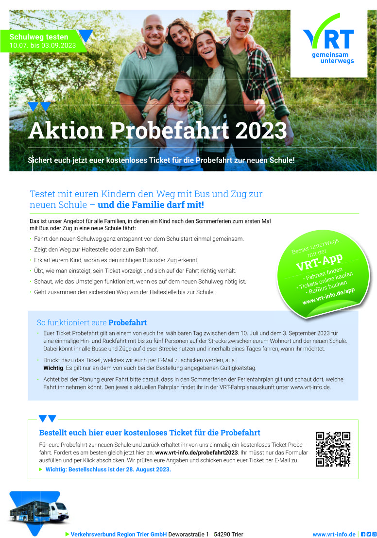 Ab Anfang Juli 2024 finden die Schülerinnen und Schülern bzw. deren Eltern und Erziehungsberechtigte über die VRT-Online-Fahrplanauskunft unter www.vrt-info.de/fahrplanauskunft ihre gewünschten Verbindungen. Einfach Startort, Ziel, Datum und Uhrzeit eingeben und schon werden alle Infos zu den verfügbaren Verbindungen, den Ticketpreisen, Umstiegen und der Fahrtdauer angezeigt. Wer es noch einfacher möchte: Auf der zweiten Seite des PDFs im Anhang ist eine Karte, auf der die einzelnen Orte des neuen Busnetzes Wittlicher Land mit der Fahrplanauskunft des VRT verlinkt sind. Einfach Ort anklicken und schon wird online die Fahrplanauskunft aufgerufen.