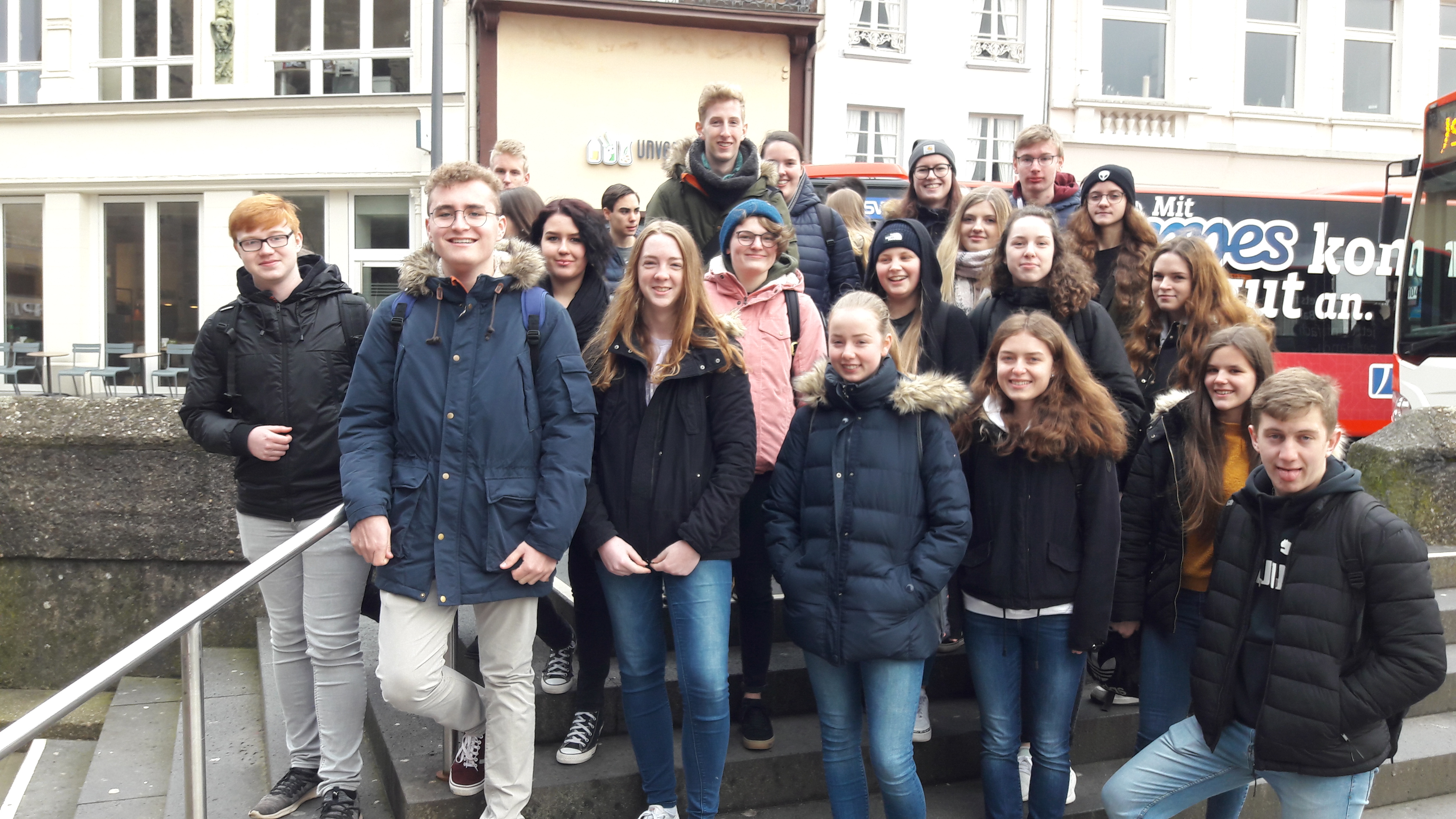 Am 06.03.2024 fuhren wir mit 22 Schülern der 7.Klasse des Wahlpflichtfachs Kunst und Kultur nach Trier ins Theater. Zuvor haben wir im Wahlpflichtfach, das Darstellendes Spiel und Kunst umfasst, alles rund um Theaterproduktionen und Berufe am Theater gelernt. Wir durften an diesem Tag einen Blick hinter die Kulissen des Theaters werfen.