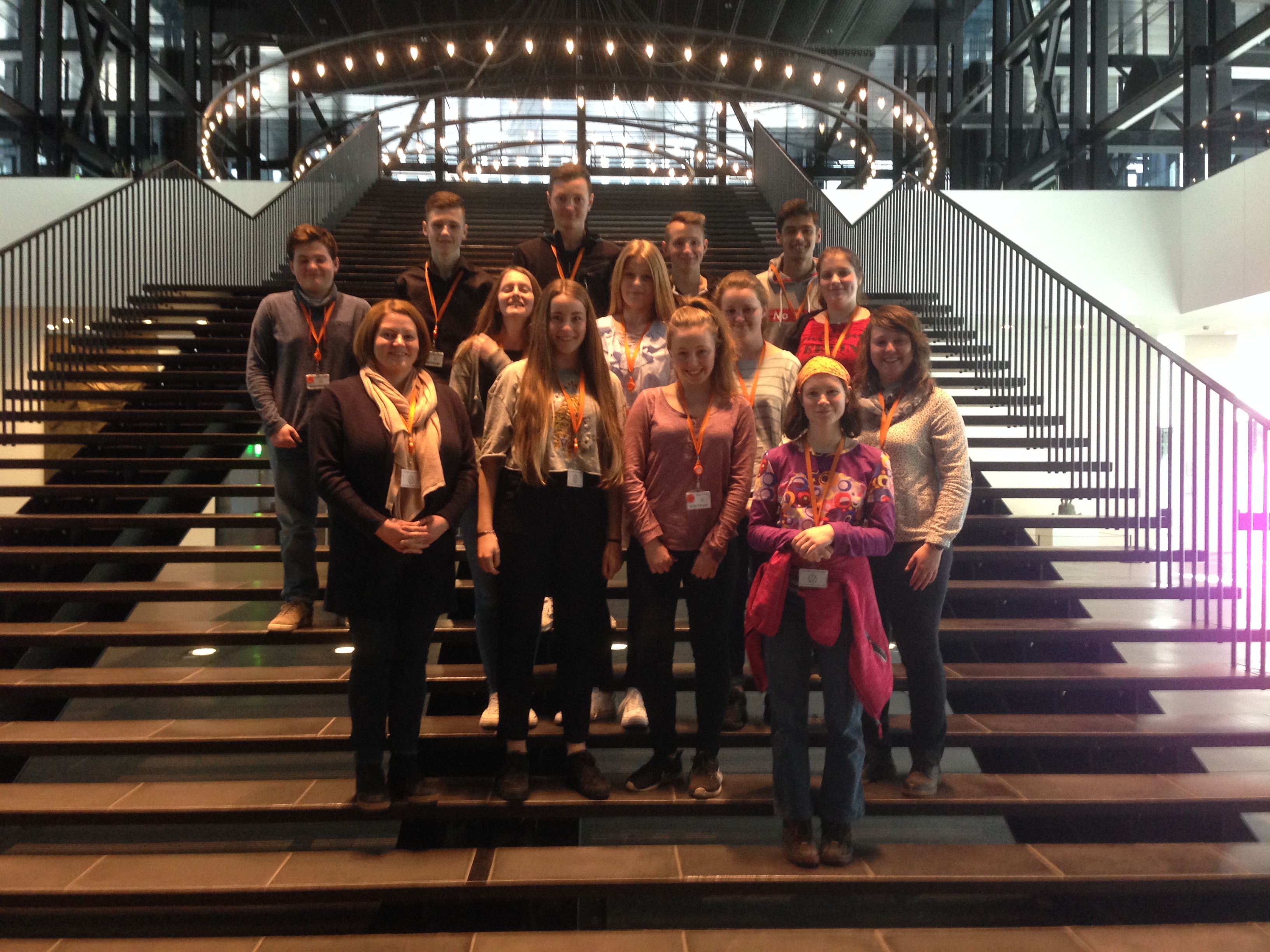 Als wir ankamen, wurden wir herzlich begrüßt von Carola Ehrt und unsere Jacken und Taschen wurden von einer sehr netten Dame an die Garderobe gehangen. Dann hat sich Frau Ehrt und ihren Job am Theater vorgestellt und mit uns über die anderen Berufe am Theater gesprochen. Danach gingen wir eine große Treppe hinauf in die erste Etage, während uns erzählt wurde, dass dieses Theater ein Drei-Spalten-Theater ist mit Schauspiel, Musik und Tanz. In dem Treppenhaus hingen überall Bilder von Schauspielern, Tänzern und Musikern. Uns wurde erklärt, dass es auch angestellte Schauspieler gibt, das bedeutet, wenn ein Stück ausgesucht wird, wird geschaut, welche Schauspieler am besten die Rolle spielen und umsetzen können. Gibt es zu wenige Schauspieler für ein Stück, kommen aus anderen Orten Schauspieler und helfen dann in Trier aus.